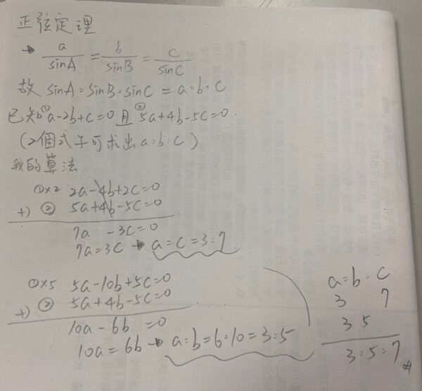 。已知a-2b+c=0 且5a+4b-5c=0,試求sin A:sin B:sinC為何?