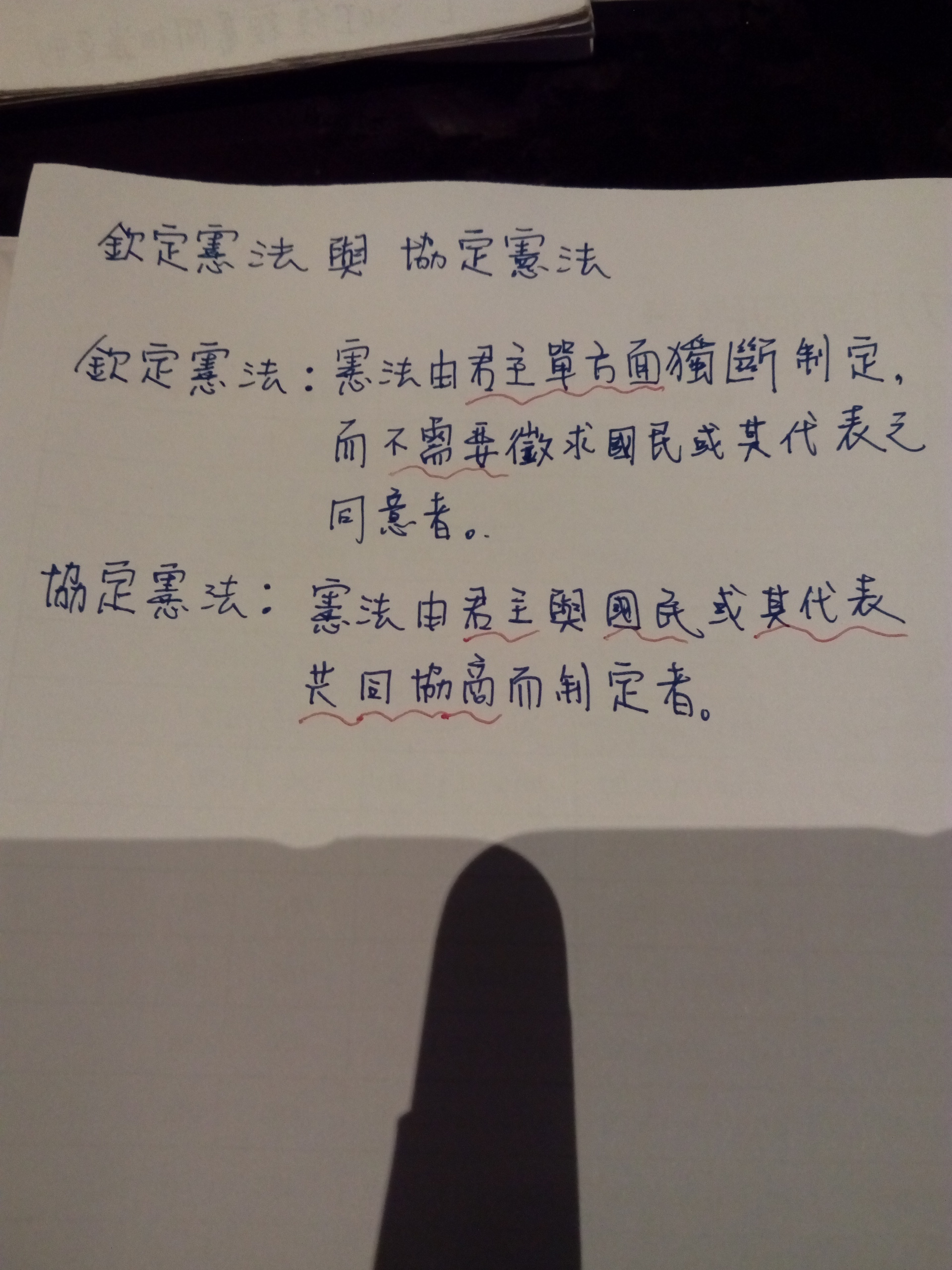 欽定憲法=由君王主導 協定憲法=由君王與人民協力完成