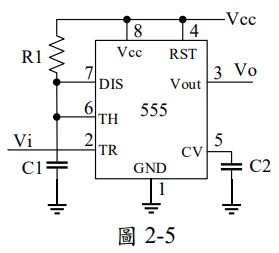 6. 如圖2-5 所示電路,若R1 = 1KΩ,C1 = 1uF,Vi 為一100Hz的方波,請問 Vo 的工作週期為_____________。